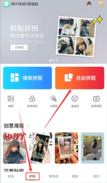 1、打开,点击【修图】、【自由拼图】