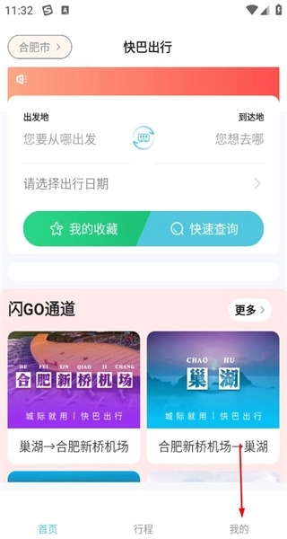 1、打开快巴出行首页后,能看到出发地和到达地的输入框,旁边还有闪GO通道,接着点击“我的”进入个人中心页面。