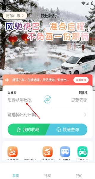 4、返回首页并切换城市后,找到出发地与到达地的输入区域,准备填写相关信息以查询行程。