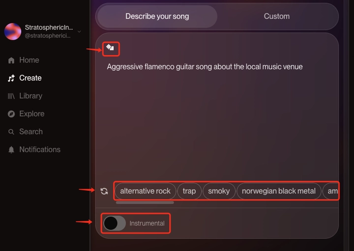 是否开启纯音乐(Instrumental):默认处于关闭状态,开启后生成的将是不含歌词的纯音乐。