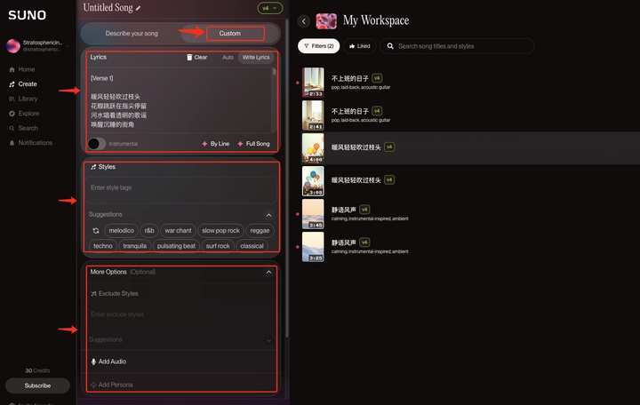 Suno有两种生成歌曲的途径:一是基础模式,通过输入提示词就能直接生成;二是自定义模式,可以对歌词、音乐风格、角色等进行自主设定。