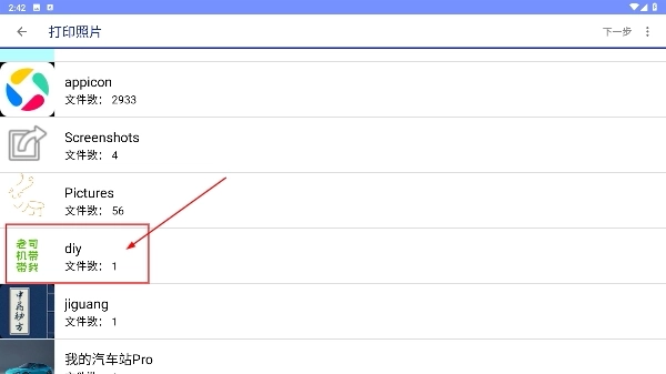 2、进入打印照片页面后,找到目标文件所在的文件夹(例如“diy”文件夹),点击进入该文件夹以查看其中的内容。