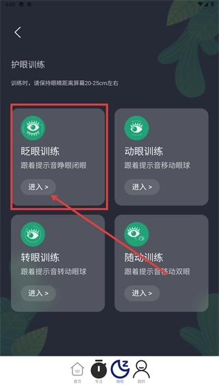 3、在护眼训练分类下,点击“眨眼训练”旁的“进入”按钮,即可进入该训练的具体操作界面。