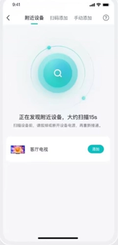 请确认设备是否已进入可连接网络的状态,若未进入,可通过断开设备电源后重新通电的方式尝试激活,也可以在对应的应用程序添加设备的页面中,选择“扫码添加”或者“手动添加”这两种方式,然后根据页面提示的步骤来启用设备的网络配置功能。