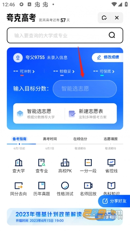 进入夸克高考页面后,在智能选志愿的输入框中填写目标分数。