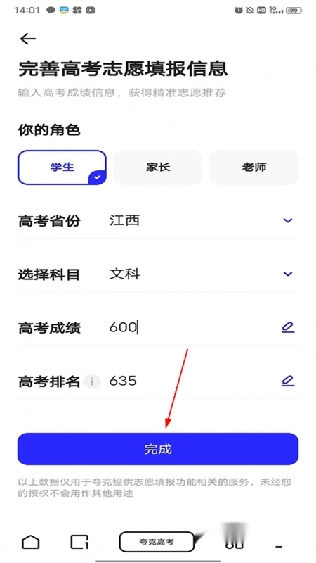 在输入目标分数前,需先完善高考志愿填报信息。点击上方的输入框后,系统会自动跳转到填报信息页面,填写完毕点击“完成”按钮即可。