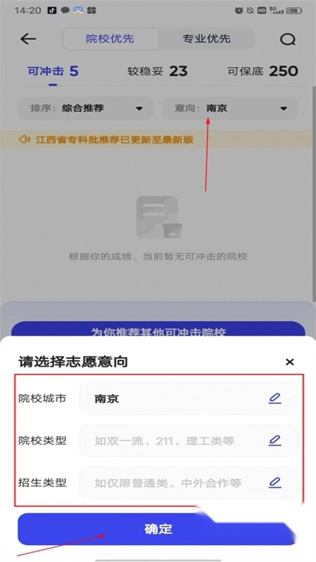 最后点击意向选项,输入你意向前往的城市,系统会依据你的分数,为你筛选出该城市中可供填报的学校;待校园类型与招生类型填写完毕后,点击确定即可。