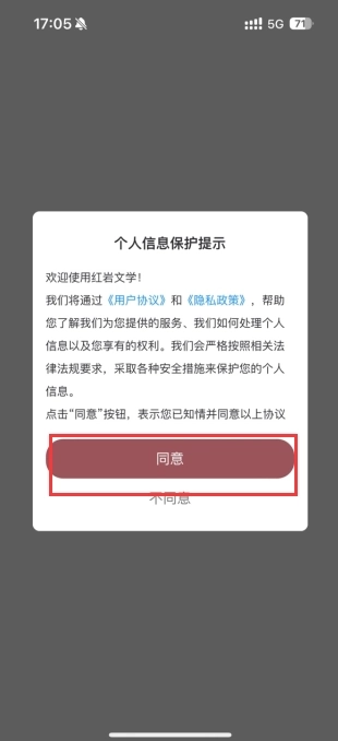 1、红岩文学,打开软件,点击【同意】