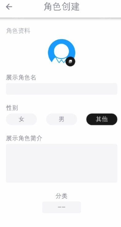 进入角色创建页面后,上传角色图片,输入角色名称,选择角色性别,并填写角色介绍。