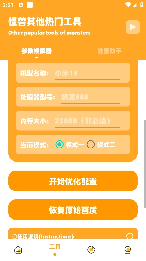 参数模拟器功能位于工具板块内,用户在此能够输入设备相关参数,选定所需模式后点击优化按钮,即可得到为其量身定制的画质设置建议。