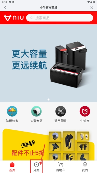 1、打开小牛电动应用,点击底部的商城选项,即可进入小牛商城页面。