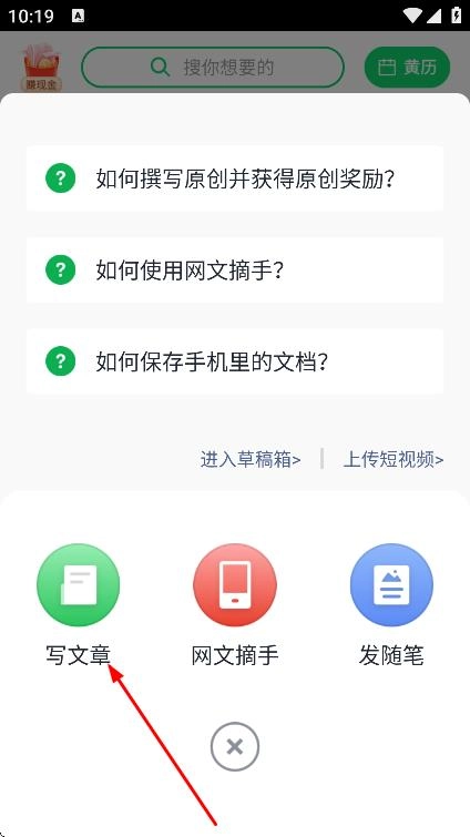 2、在功能选择页面,点击“写文章”选项,即可进入文章撰写页面。