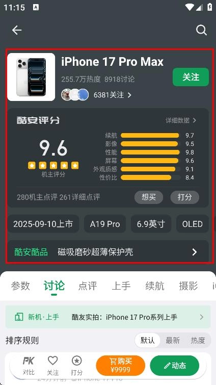 在手机详情页,能够查看该手机的酷安评分、上市时间等相关信息。