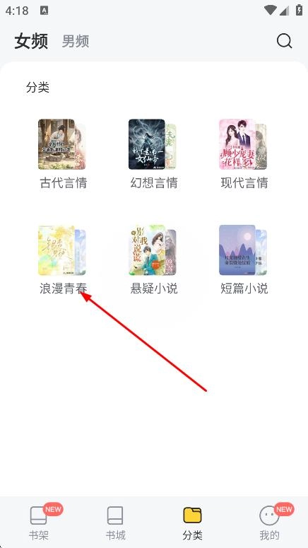 在分类页面,选择浪漫青春分类后,即可进入该类别的小说列表页面。