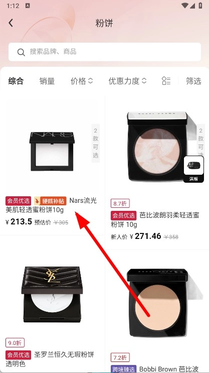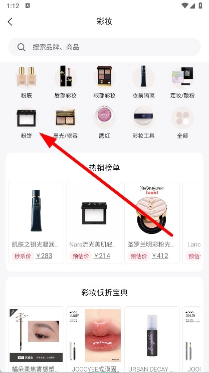 2、进入彩妆分类后,选择粉饼子分类,浏览粉饼商品列表。