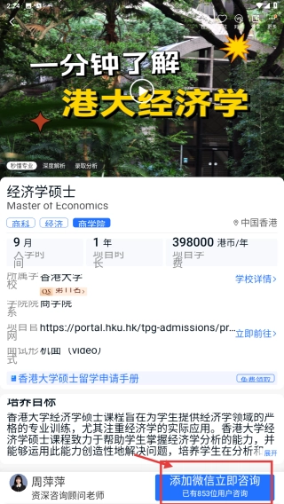 4、进入专业详情页面后,点击“添加微信立即咨询”按钮,即可获取留学咨询服务。