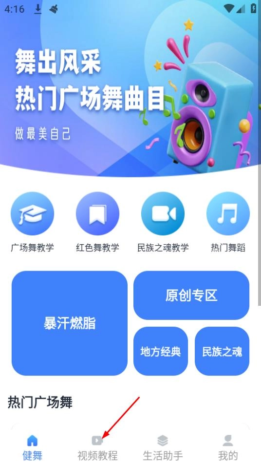 1、进入精彩广场舞板块,点击视频教程入口就能进入视频学习页面。