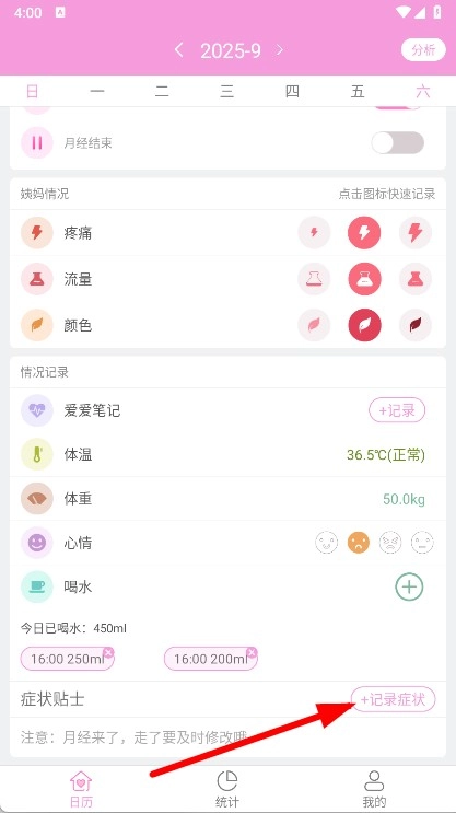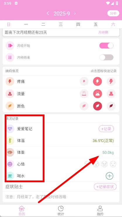 2、在情况记录区域,记录爱爱笔记、体温、体重等信息。