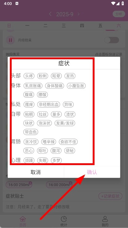 4、在弹出的选择框里,勾选对应的症状选项,选完后点击确认按钮,即可完成本次记录。