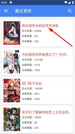4、在最近更新页面,找到“绝对城学长的妖怪学讲座”并点击,即可进入该小说的详情页面。