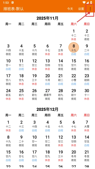 打开排班管理类别,点击右上角的三点菜单按钮,展开功能列表。