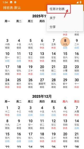 我的排班表是一款面向制造业倒班人员、服务业值班人员等轮班群体的排班记事工具,借助万年历界面提升排班管理体验。它以直观的万年历形式展示当月排班、倒班、假期等信息,利用彩色圆圈或文字标注不同工作日与休息日,允许用户自定义添加排班班次及标记颜色,还配备了一键定位今日排班的便捷功能。