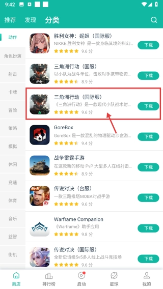 3、在动作分类的游戏列表页面中,找到并选择《三角洲行动》国服游戏,随后进入该游戏的详情页面。