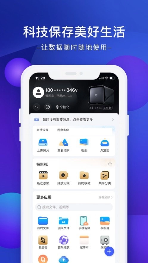 极空间是天顶星公司推出的私有云产品,能够帮助用户将手机、电脑、平板里的照片、视频及各类文件自动备份至个人私有硬盘,避免重要数据遗失。