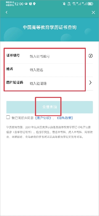 2. 当进入中国高等教育学历证书查询界面,依据要求填入证书编号、姓名以及图片验证码,随后点击【免费查询】。