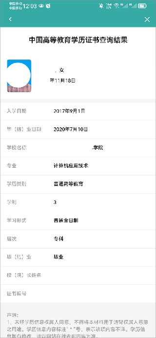 4、点击“免费查询”,系统会对手机号码进行验证,验证通过后,就能查询到学历结果。