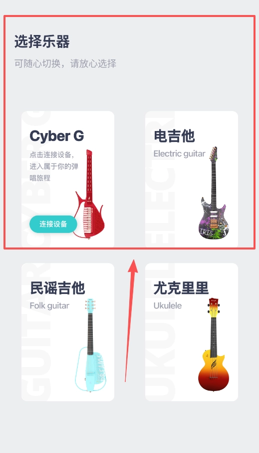 2、在主界面找到选择乐器入口,里面有电吉他、民谣吉他、尤克里里等多种选项,还能连接cyber g智能设备。