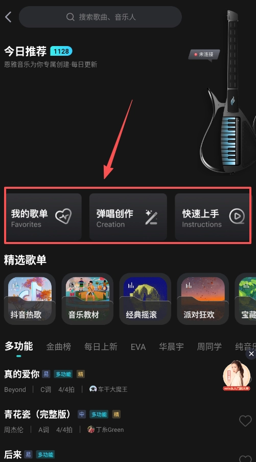 3、进入首页后可以看到今日推荐歌单和各类曲谱,比如快速上手或弹唱创作板块,选择一首喜欢的歌。