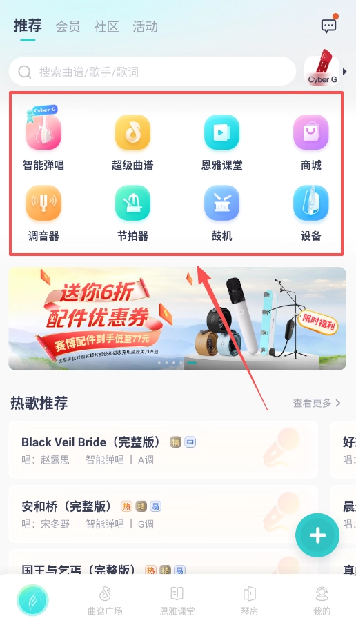 4、想找更多功能的话,底部有调音器、节拍器等工具,顶部还能搜索曲谱或歌手,多逛逛推荐和社区板块。