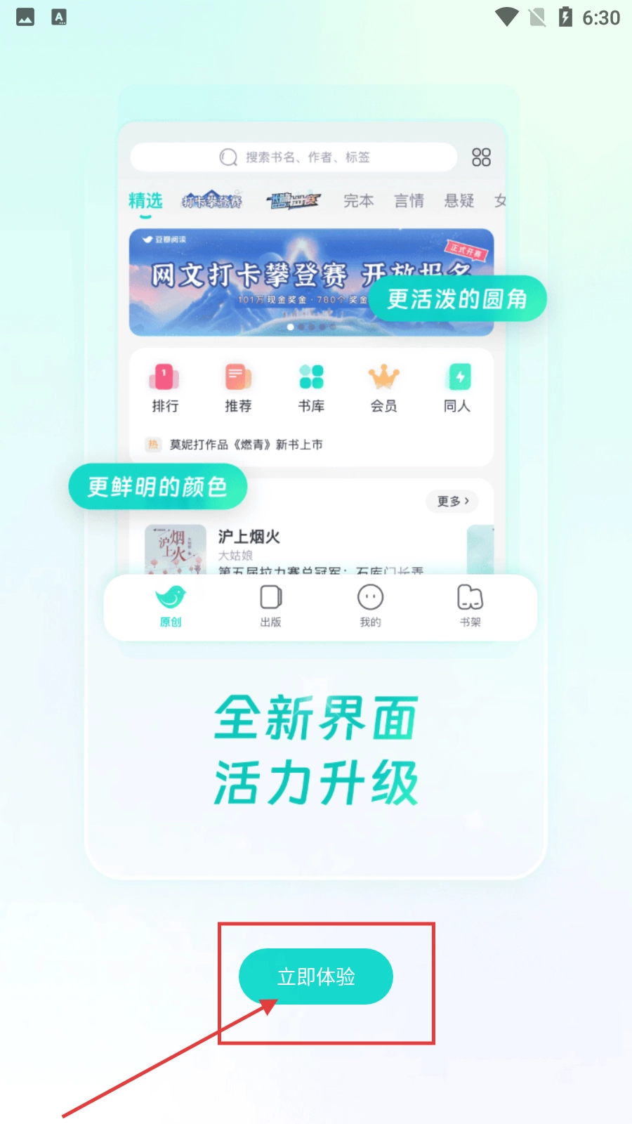 1、点击【立即体验】按钮,进入豆瓣阅读使用流程。