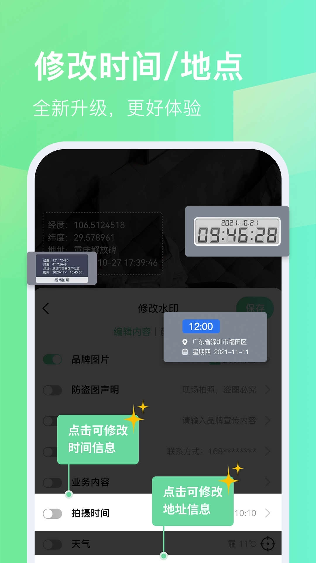 6、提供工程记录、执勤巡逻等工作场景的水印支持,同时提升照片清晰度;配备多种打卡专属水印模板,能精准定位当前位置,及时记录工作与生活瞬间。