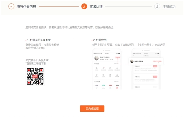 3、跳转至「今日头条」完成实名认证,这是成为平台作者的必要环节。
