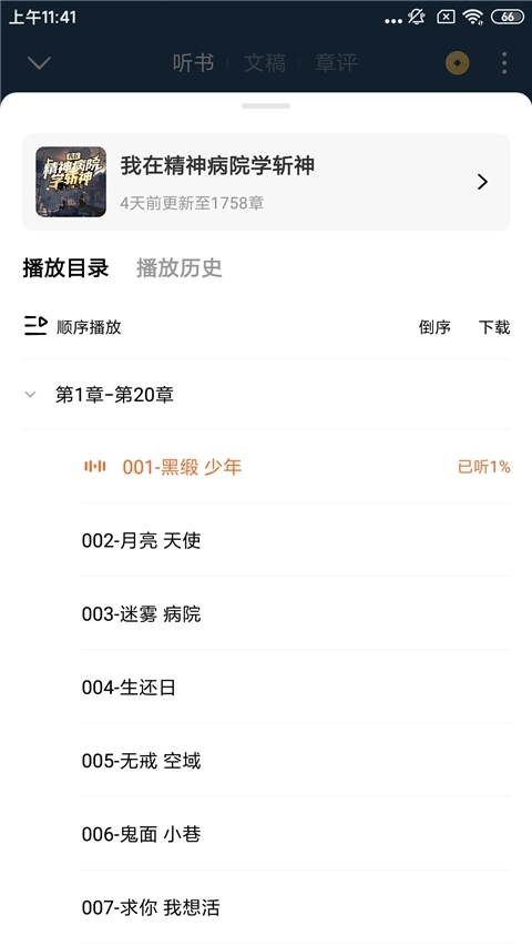 3、现在就可以开始听书啦,通过操作播放界面,能够随时切换不同章节。