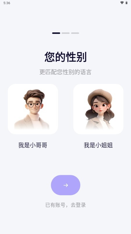 2、选择您的性别,以便获取更贴合您性别的语言。