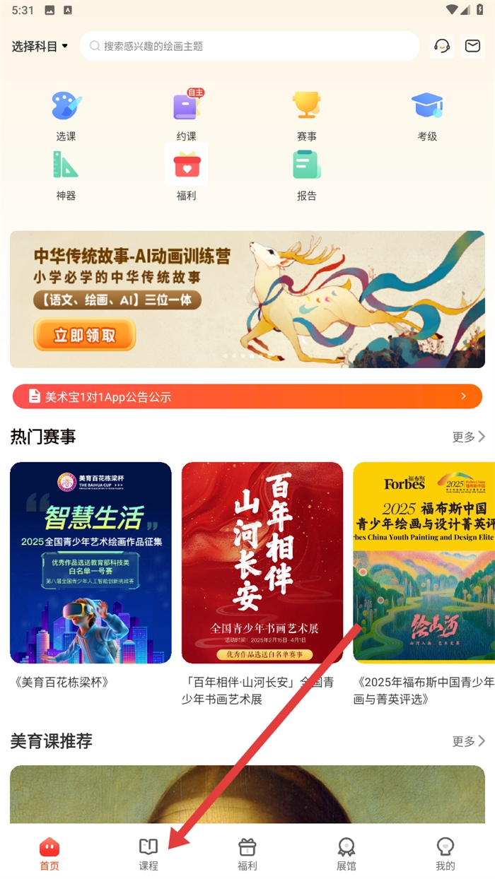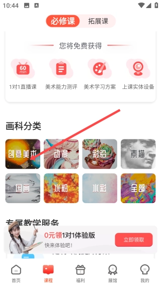 1、大家可以点击底部的【课程】板块,进入课程选择页面,开启美术课程的学习之旅哦。