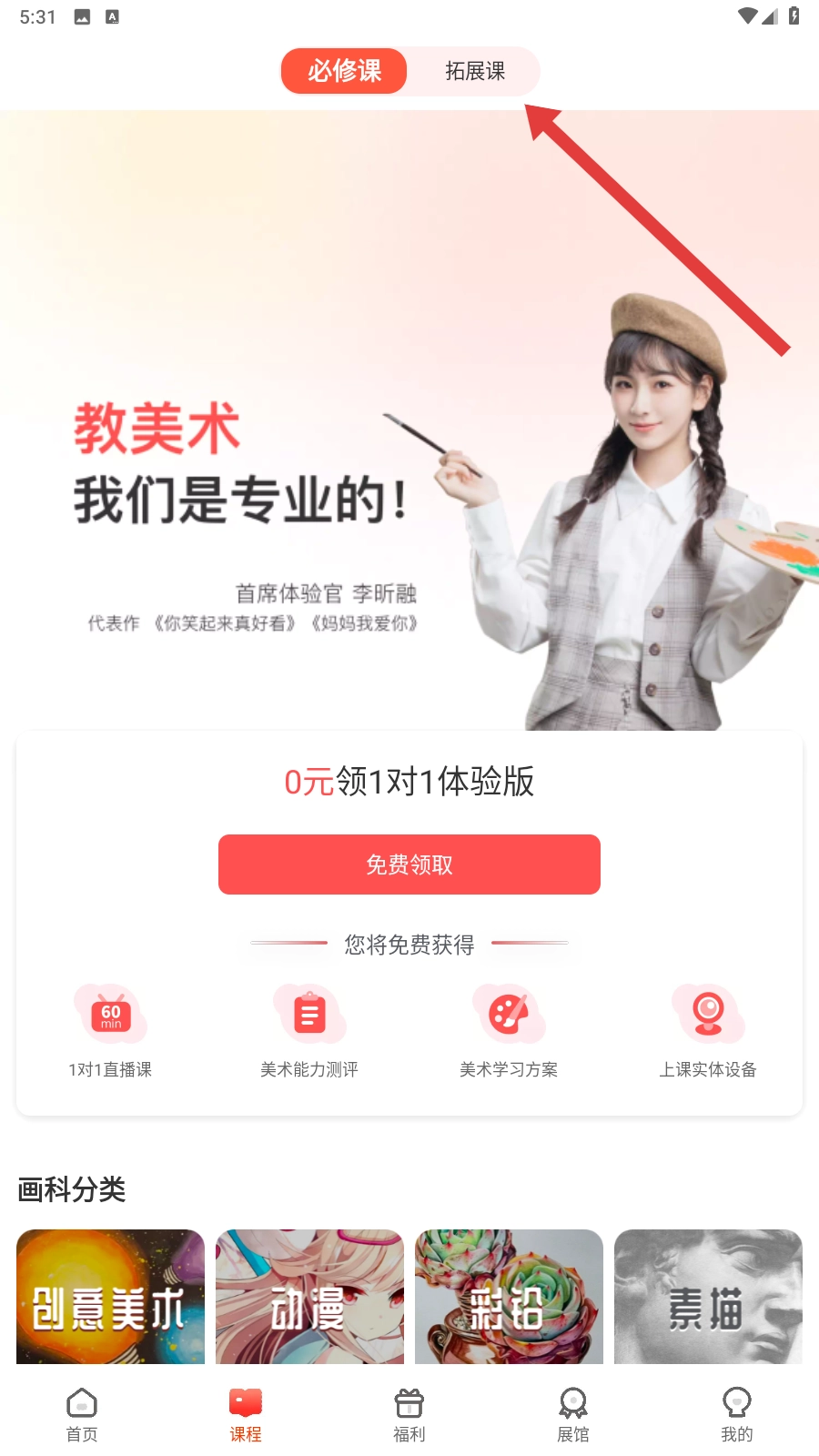 2、进入课程页面后,点击【拓展课】选项,就能浏览各类丰富的拓展类美术课程,从中挑选自己感兴趣的内容啦。