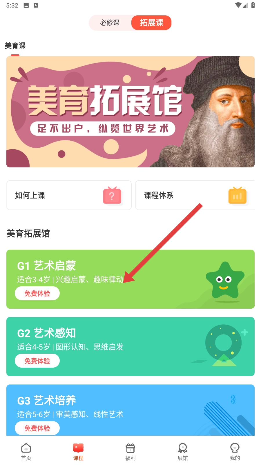 3、在拓展课板块里,挑选合适的课程类型,比如【G1艺术启蒙】,然后进入课程详情页哦。