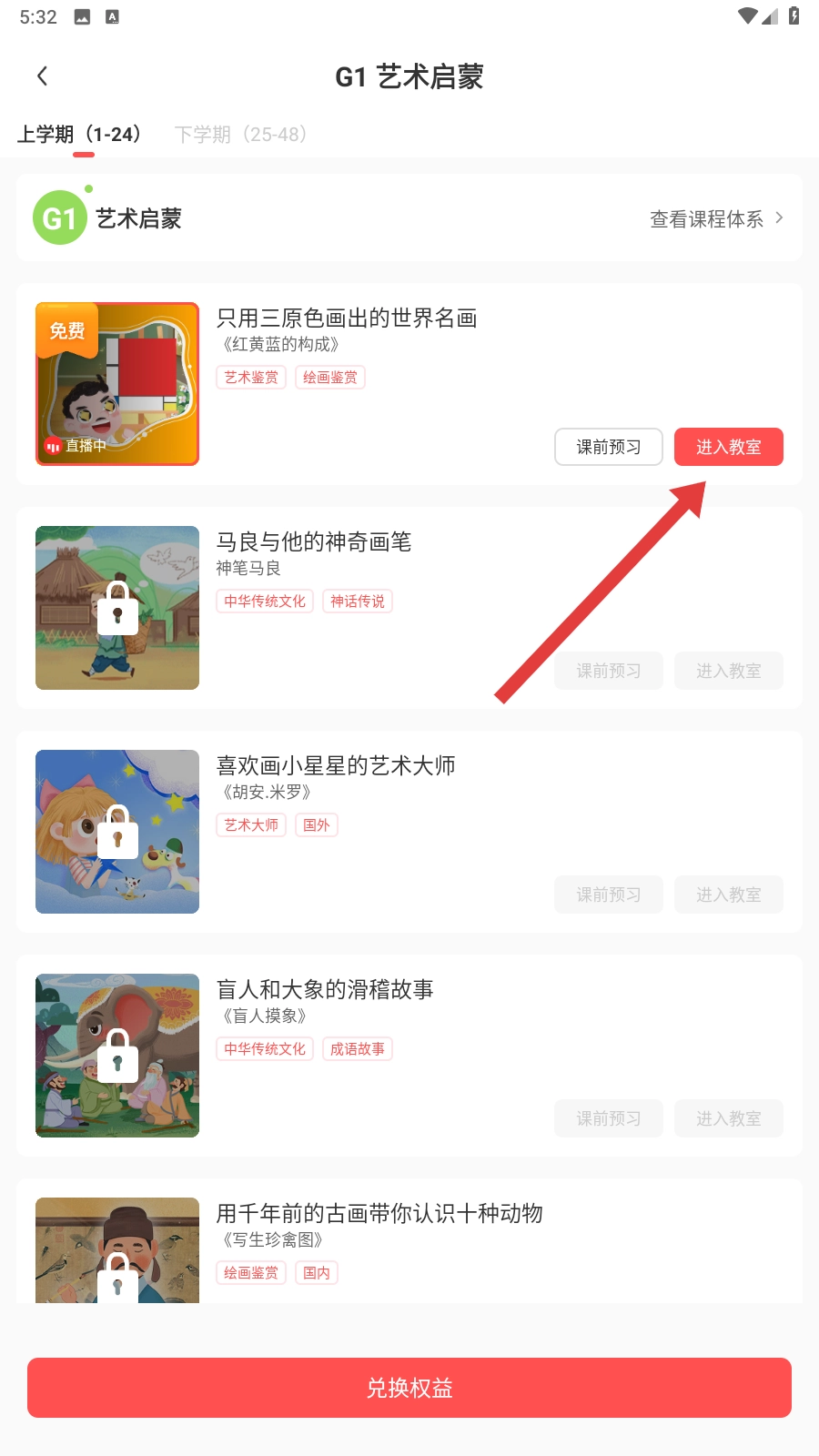 4、找到需要学习的课程后,点击【进入教室】按钮,即可开启美术课程的学习,踏上艺术探索之旅。
