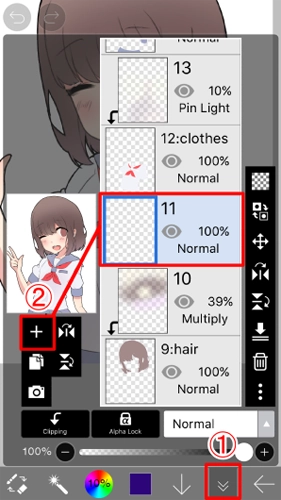 8、点击加号按钮在 "图层" 窗口中, 为阴影添加图层, 使其成为当前图层, 并将③混合模式 "乘法"并最终转到步骤四剪切on。另外, 将画笔颜色更改为黑色。