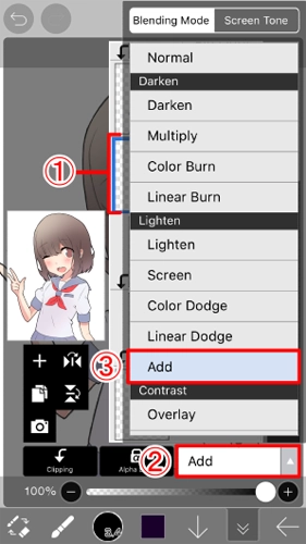 3、点击图层1使添加的图层成为当前图层。然后点击"添加"以打开步骤2的混合模式菜单。最后选择步骤3在 "混合" 菜单中添加。