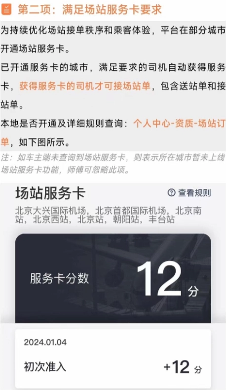 注意,场站服务卡初始 12 分,遵守规则避免扣分至 0 分失去资格,每完成 3 单加 1 分。