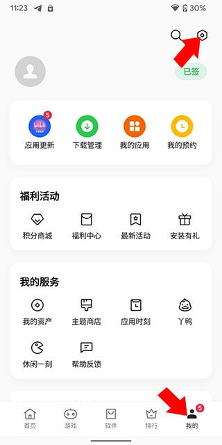 点击页面右下方的“我的”选项,进入个人中心界面后,再点击右上方的设置按钮。