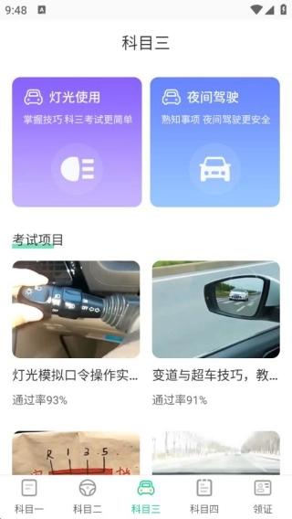 3、科目三的考试项目需进行查看,包括灯光使用、夜间驾驶等内容,要掌握相关技巧。