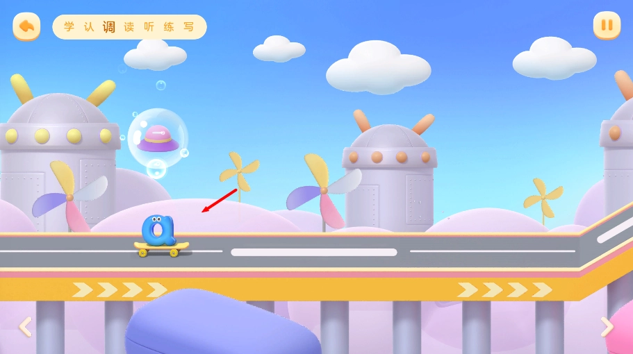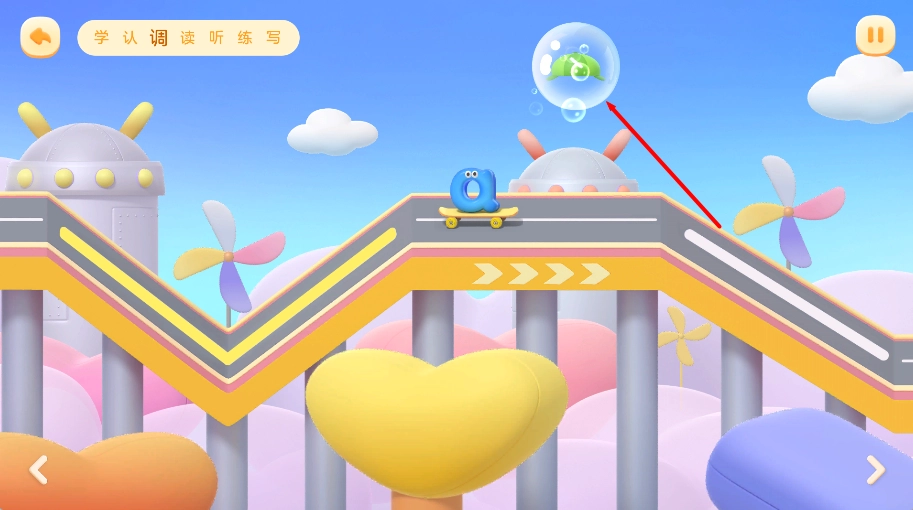 1、打开《帮帮拼音》后,从字母A开始学习,点击字母A上方的透明泡泡即可启动滑行动画,带领进入拼音学习环节。