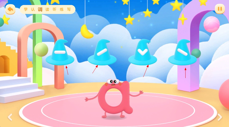3、完成滑行后,将界面中出现的四个蓝色声调帽子拖动到字母A上,通过发音与声调匹配练习,掌握A的四个声调变化。