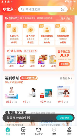 【健康权益】涵盖药品、保健、滋补等各类健康实物产品,以及问诊、体检、疫苗等诸多医疗服务,全方位的健康权益一应俱全,让您每日尽享超值福利。